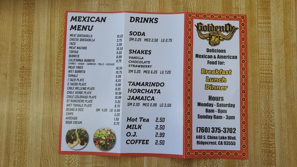 Welcome to Golden Ox, your go-to dining destination in Ridgecrest, CA! Nestled at 440 S China Lake Blvd, we serve up a delightful blend of Mexican and American cuisine, perfect for breakfast, lunch, and dinner. Enjoy the laid-back ambiance with both indoor seating and a charming terrace. Our menu features traditional dishes, small sharing plates, and kids' options, ensuring there's something for everyone. With quick service and accessible amenities, including wheelchair-friendly facilities, Golden Ox is the ideal spot for tourists and locals alike. Join us for a delicious meal or take advantage of our takeout and delivery services!